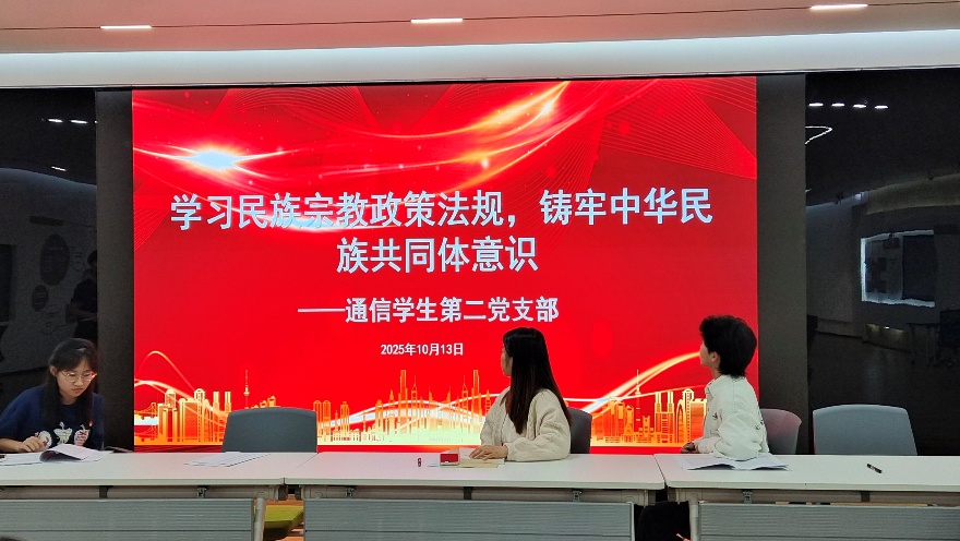 为进一步深化师生党员对民族宗教政策法规的理解和认识, 增强铸牢中华民族共同体意识的自觉性和主动性,通信学生第二党支部于2025年10月13日在信自126成功举办了“学习民族宗教政策法规,铸牢中华民族共同体意识”主题党日活动。此次活动旨在教育引导师生党员从政治和全局高度认识和对待民族宗教工作,进一步深化铸牢中华民族共同体意识的思想认识,夯实各族师生团结奋进的思想基础。