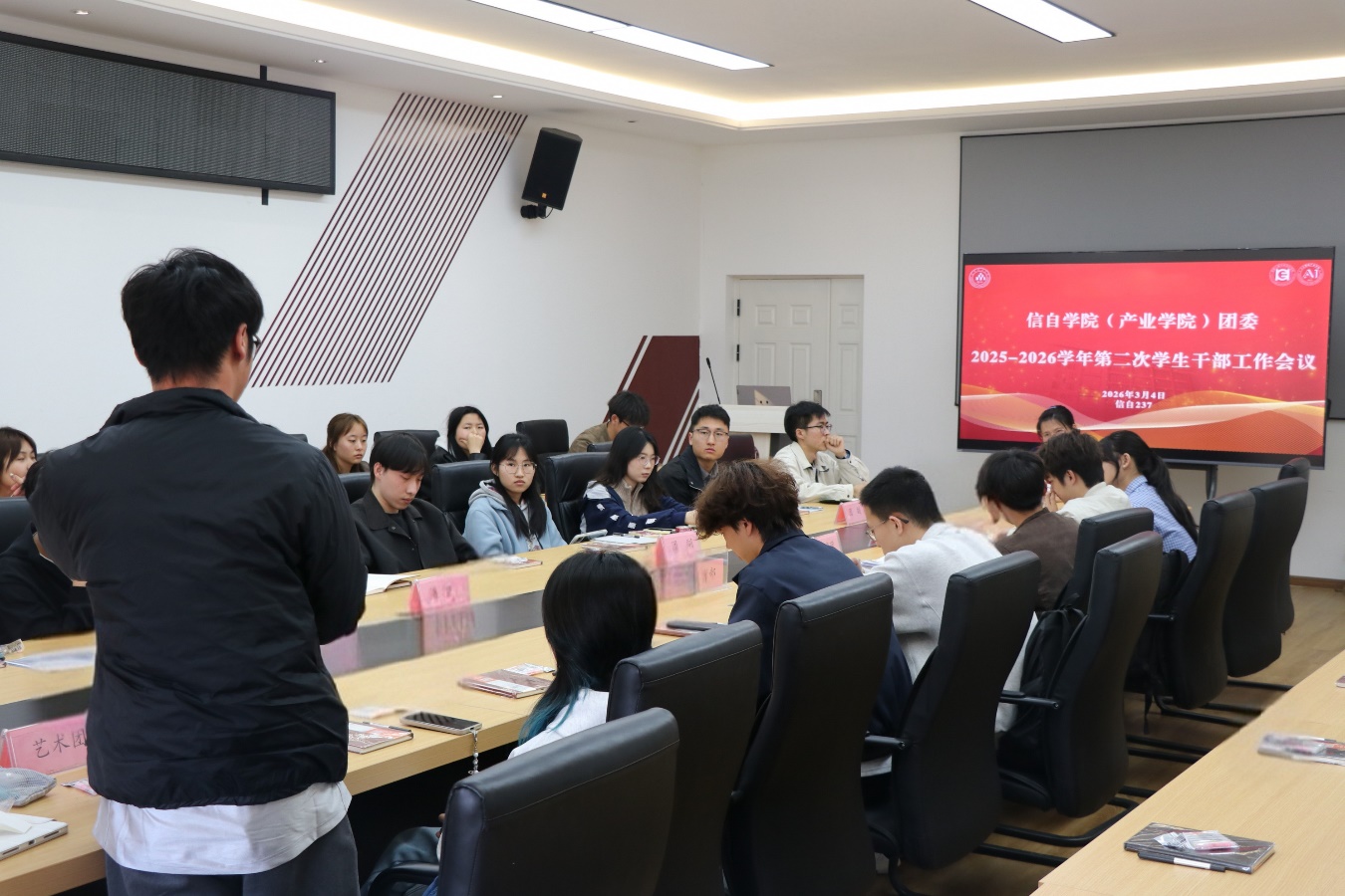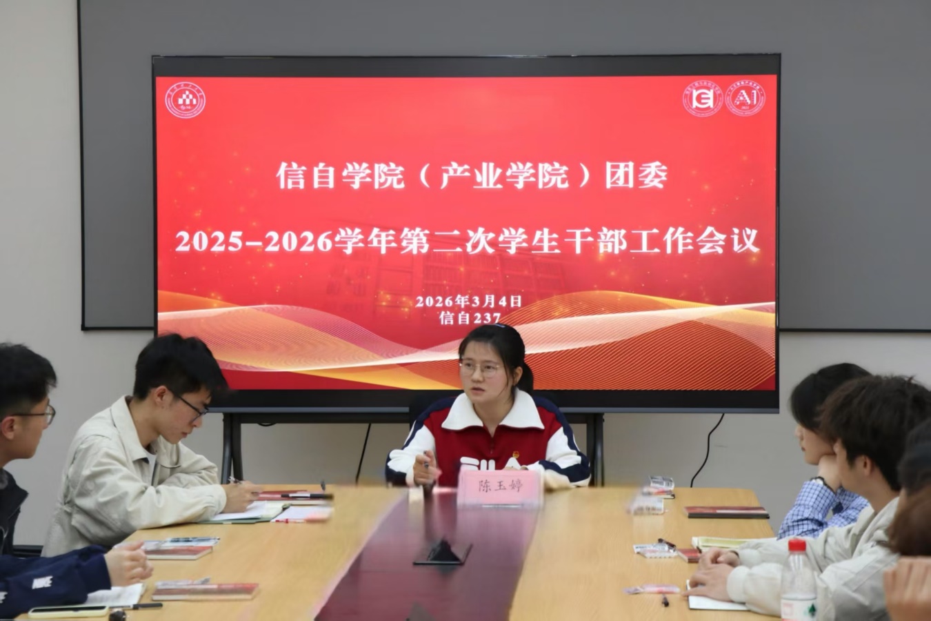 3月4日,信息工程与自动化学院(人工智能产业学院)团委在237会议室召开2025-2026学年第二次学生干部工作会议。本次会议由陈玉婷老师主持,学院团委学生会主席团成员、各部门负责人、院艺术团及各社团负责人参加本次会议。
